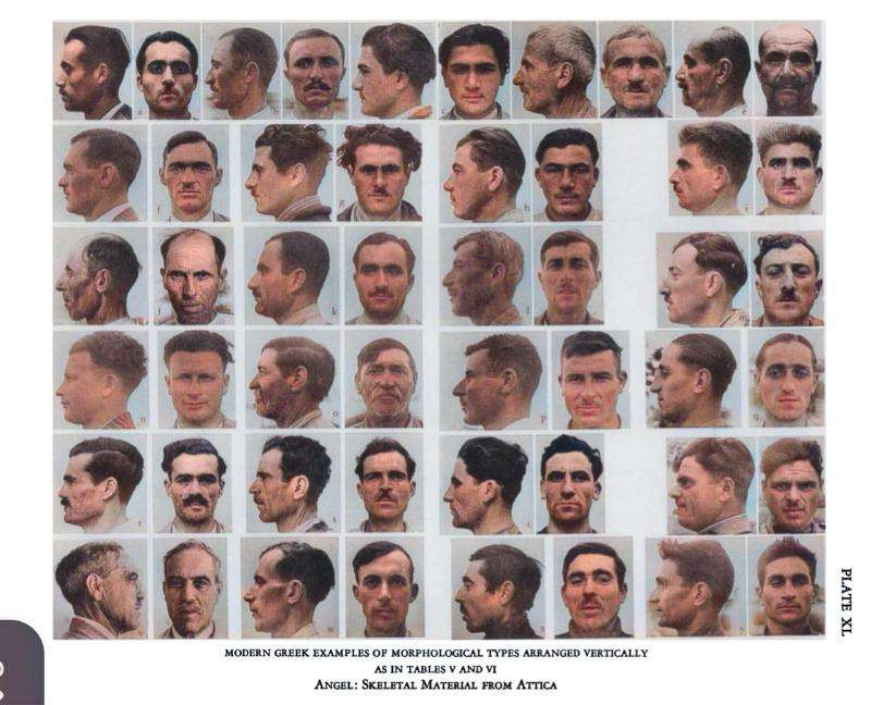 These modern Greeks were classified by J. Lawrence Angel as belonging to each of the six morphological types of the Ancient Greeks.